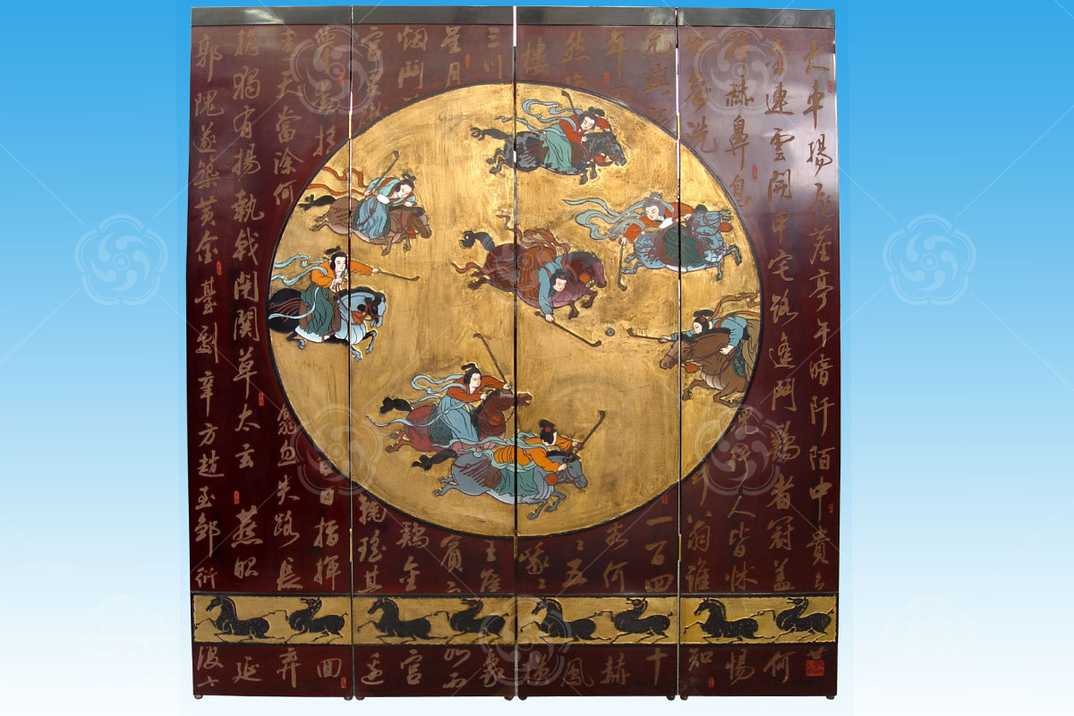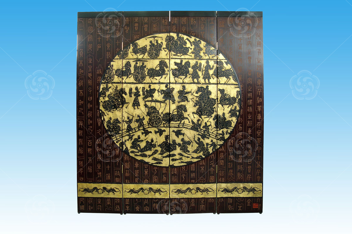 刻漆屏風屬于刻漆工藝的一種,該工藝強調橫平豎直,充分體現刻漆工藝的難度,色彩對比強烈,又不失和諧。