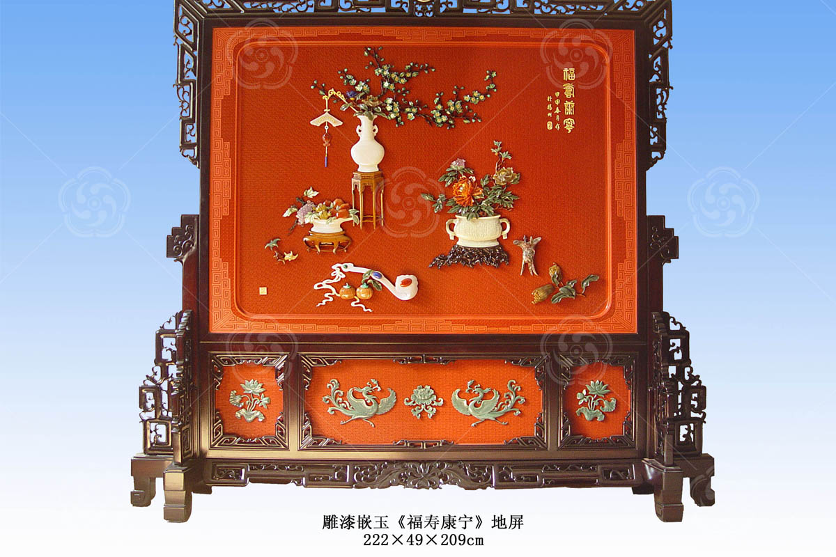 地屏配以紅木雕刻回紋圖案,使作品更加協(xié)調(diào)、主題突出,是一幅傳統(tǒng)而有新意的高檔精品。